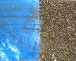 【実験方法】 FRP板の右側1/2に、市販されている船底塗料のみを塗布し、左側1/2にフジツボガードを添加した船底塗料を塗布(刷毛4回)し、海中に浸漬した 【実験場所】 三重県津市漁港 【実験期間】 2010年4月15日〜2012年10月14日(30ヶ月間) 【配合比率】 船底塗料重量に対しフジツボガードを3%添加 【実験結果】 左の写真が示すように、船底塗料のみを塗布したFRP板右側は、フジツボが密生して付着しているが、フジツボガード添加船底塗料を塗布したFRP板左側では、30ヶ月間海水中に浸漬した状態であっても、フジツボやイガイ類などの海生生物がほとんど付着しなかった |